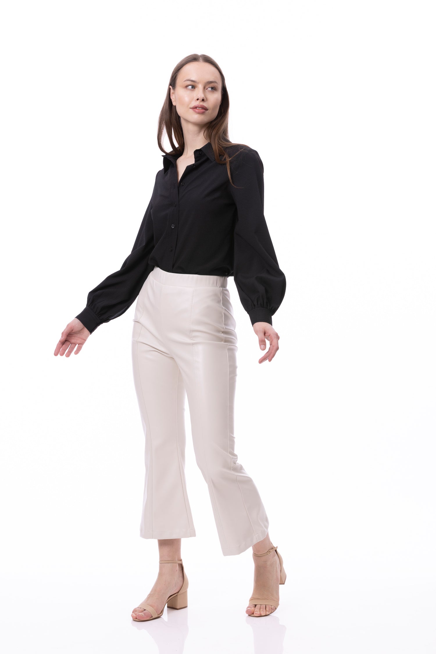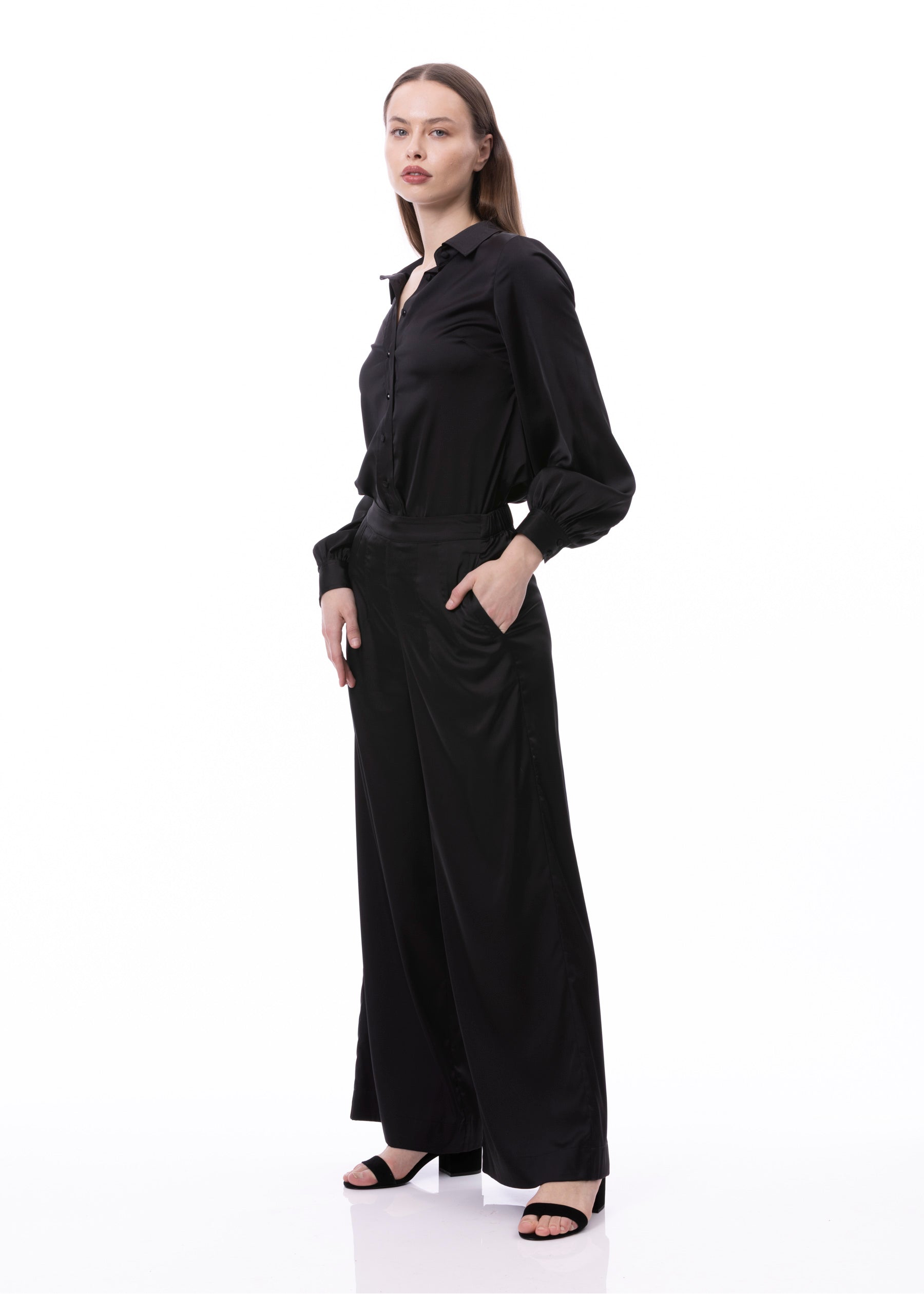 V-neck Pleat Detail Balloon Long Sleeve Blouse In Black Solid