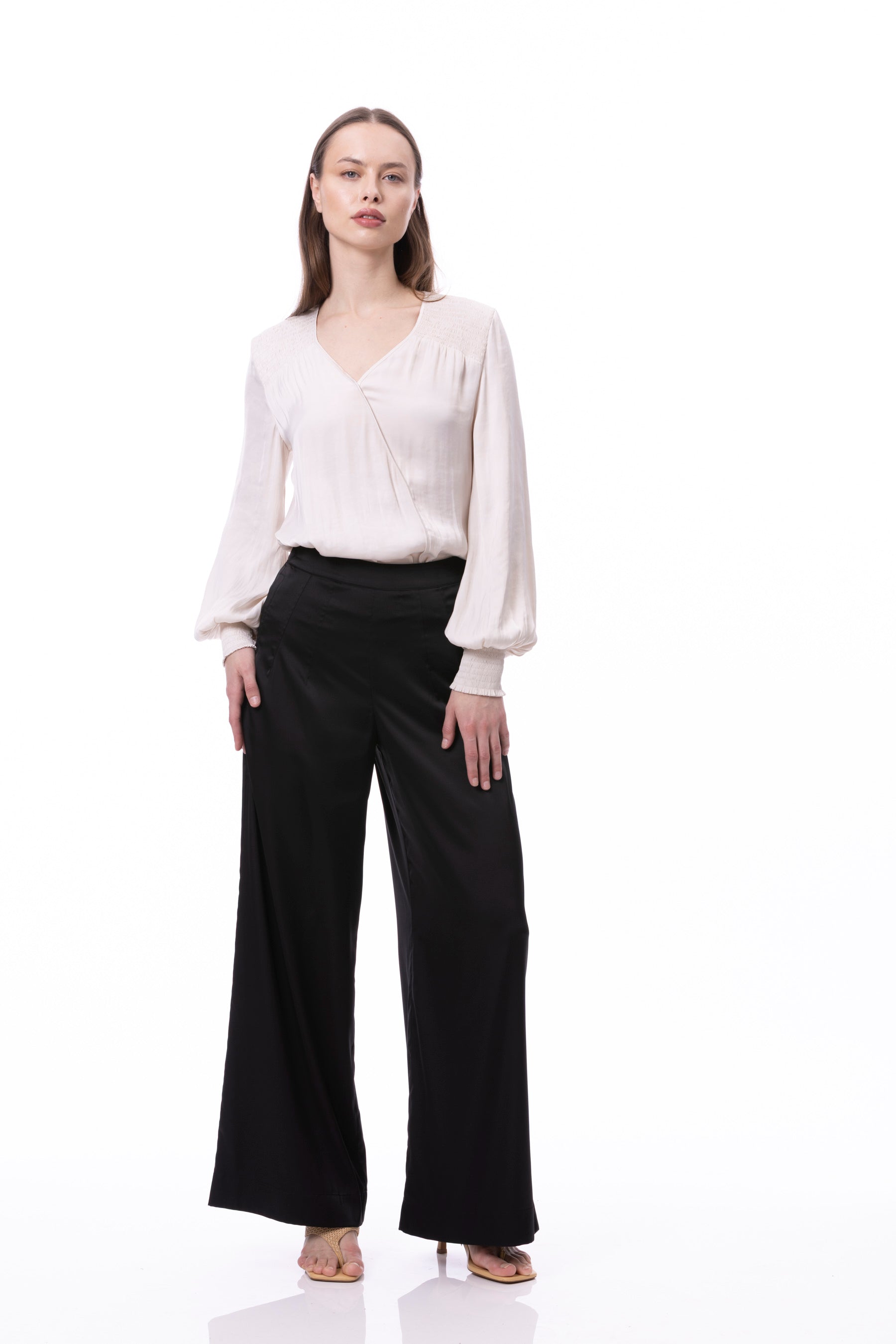 V-neck Bishop Sleeve Smocked Shoulder & Cuff Faux Wrap Blouse In Black Solid