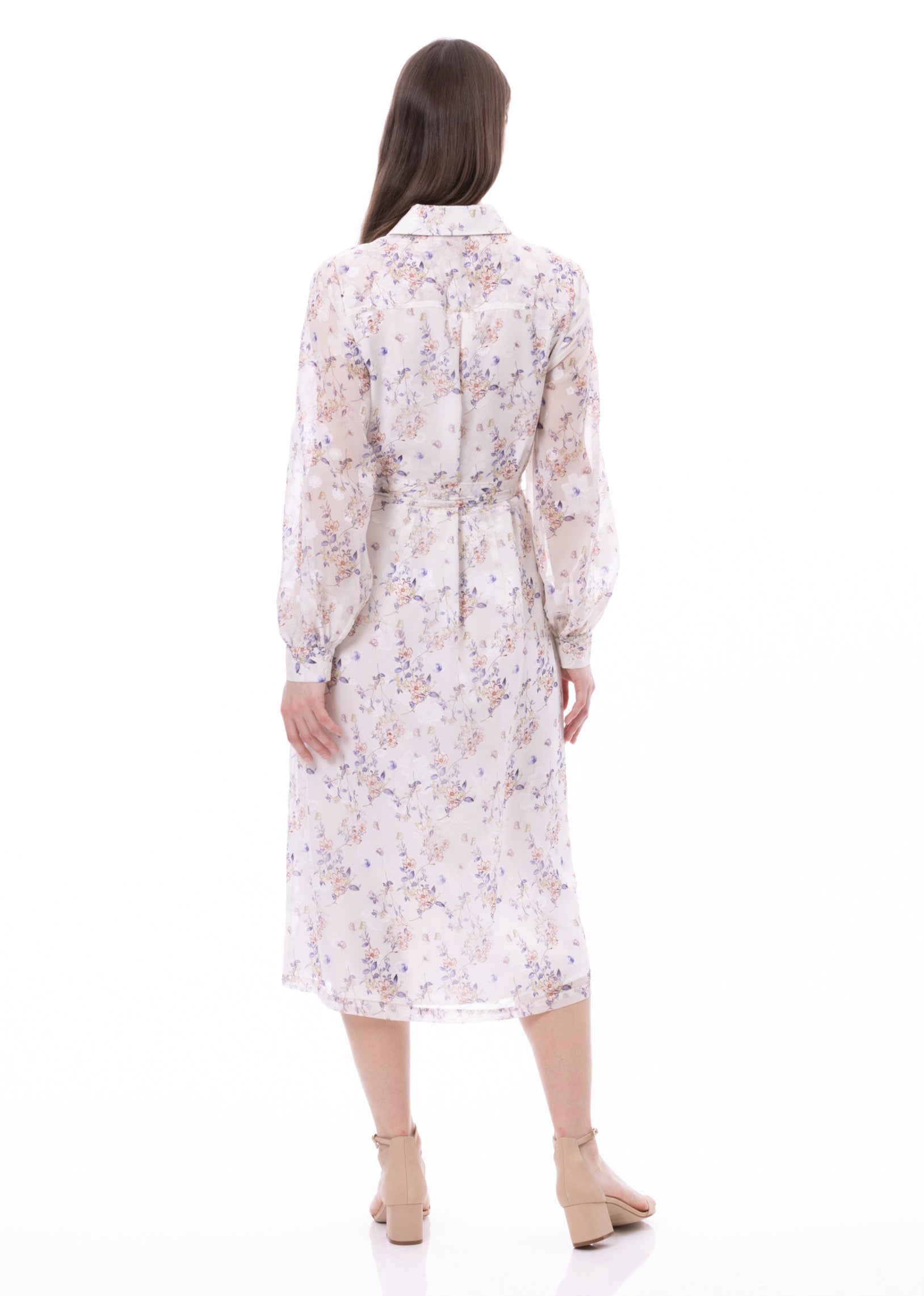 Button Down Shirt Dress With Illusion Puff Long Sleeve & Pockets In Romantic Garden Print