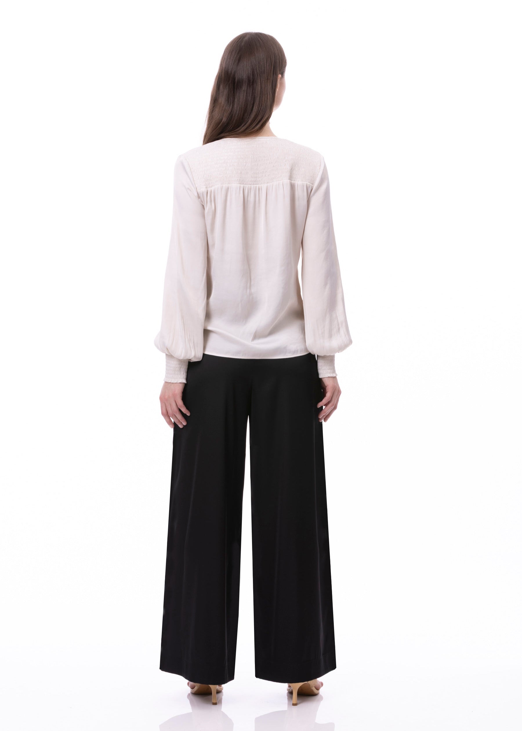 V-neck Bishop Sleeve Smocked Shoulder & Cuff Faux Wrap Blouse In Khaki Solid