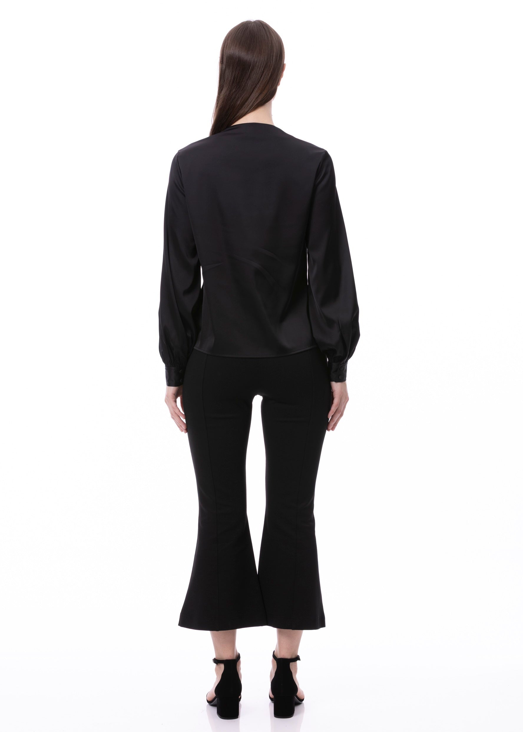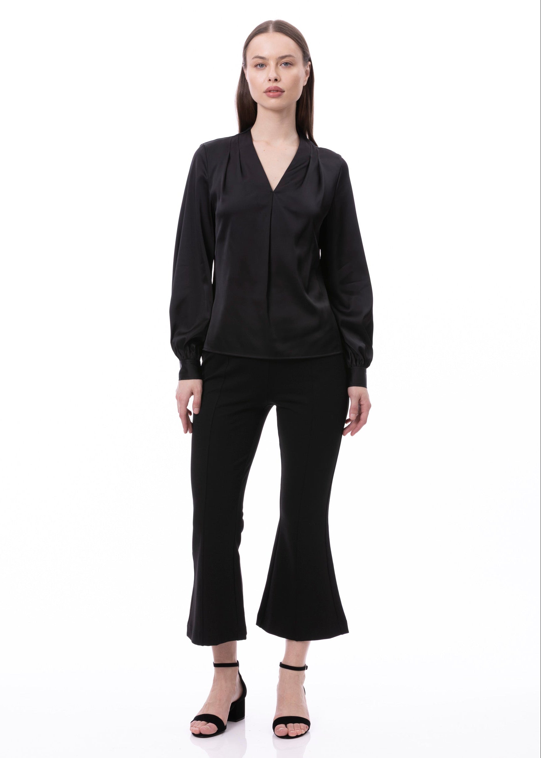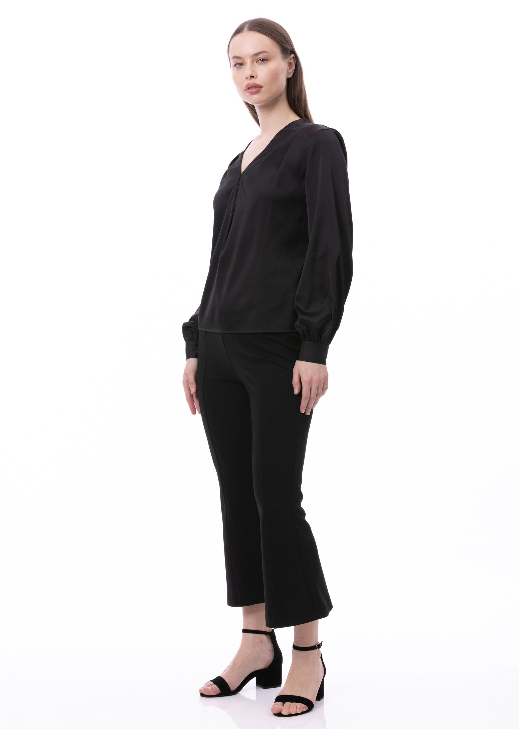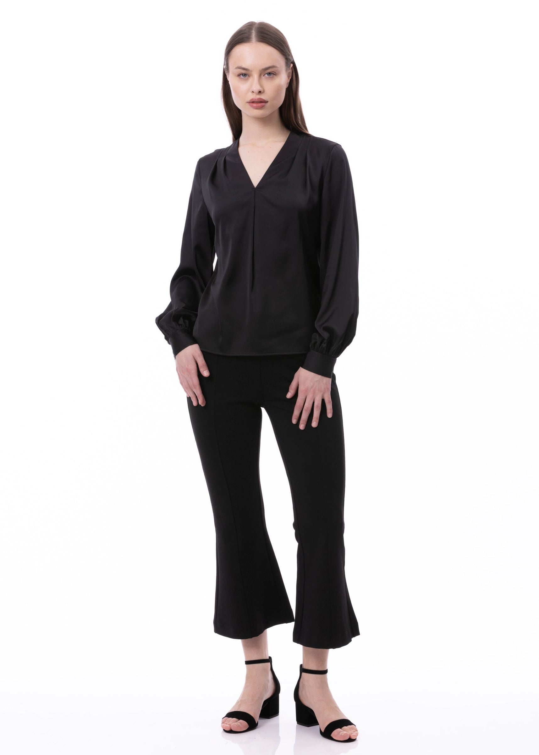 V-neck Pleat Detail Balloon Long Sleeve Blouse In Black Solid