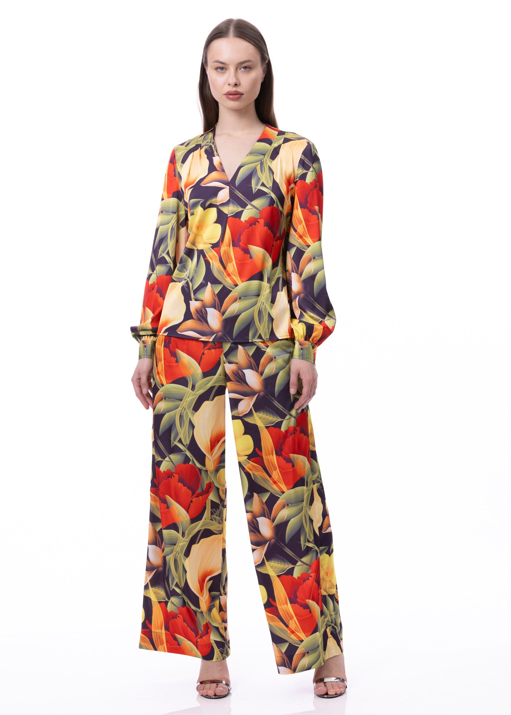 V-neck Pleat Detail Balloon Long Sleeve Blouse In Digital Floral Print